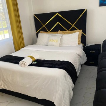 This bed features a tall, structured headboard with vertical stitched detailing and subtle golden highlights, adding a modern touch with a hint of luxury. The angular design across the headboard gives it a unique visual edge, setting it apart from standard upholstered styles.