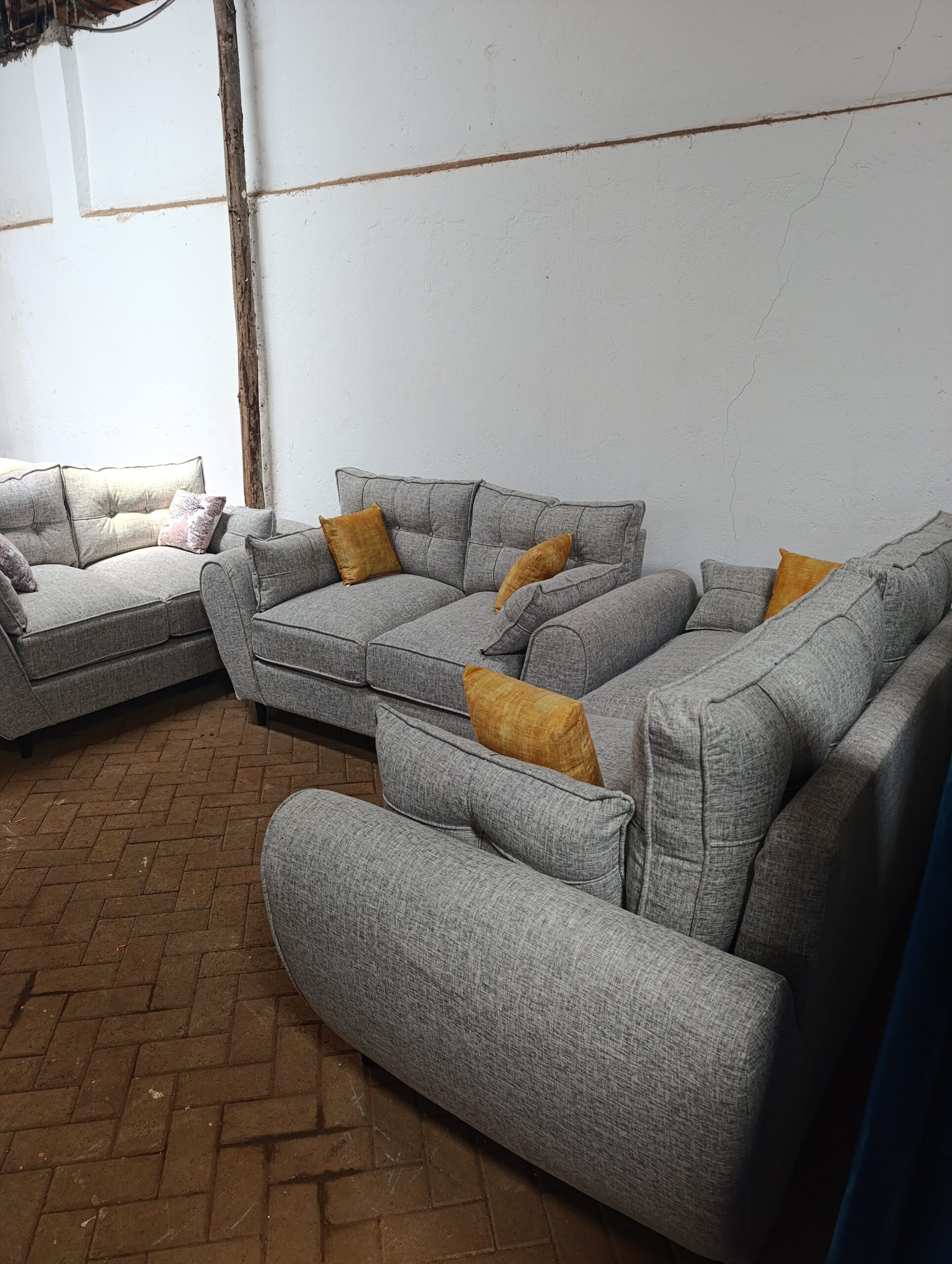 This sofa set includes two 2-seaters and 3-seater combination, both upholstered in a textured fabric with a soft, durable finish. The seats and backrests are designed with deep tufting and spring cushions, offering excellent comfort and shape retention over time.