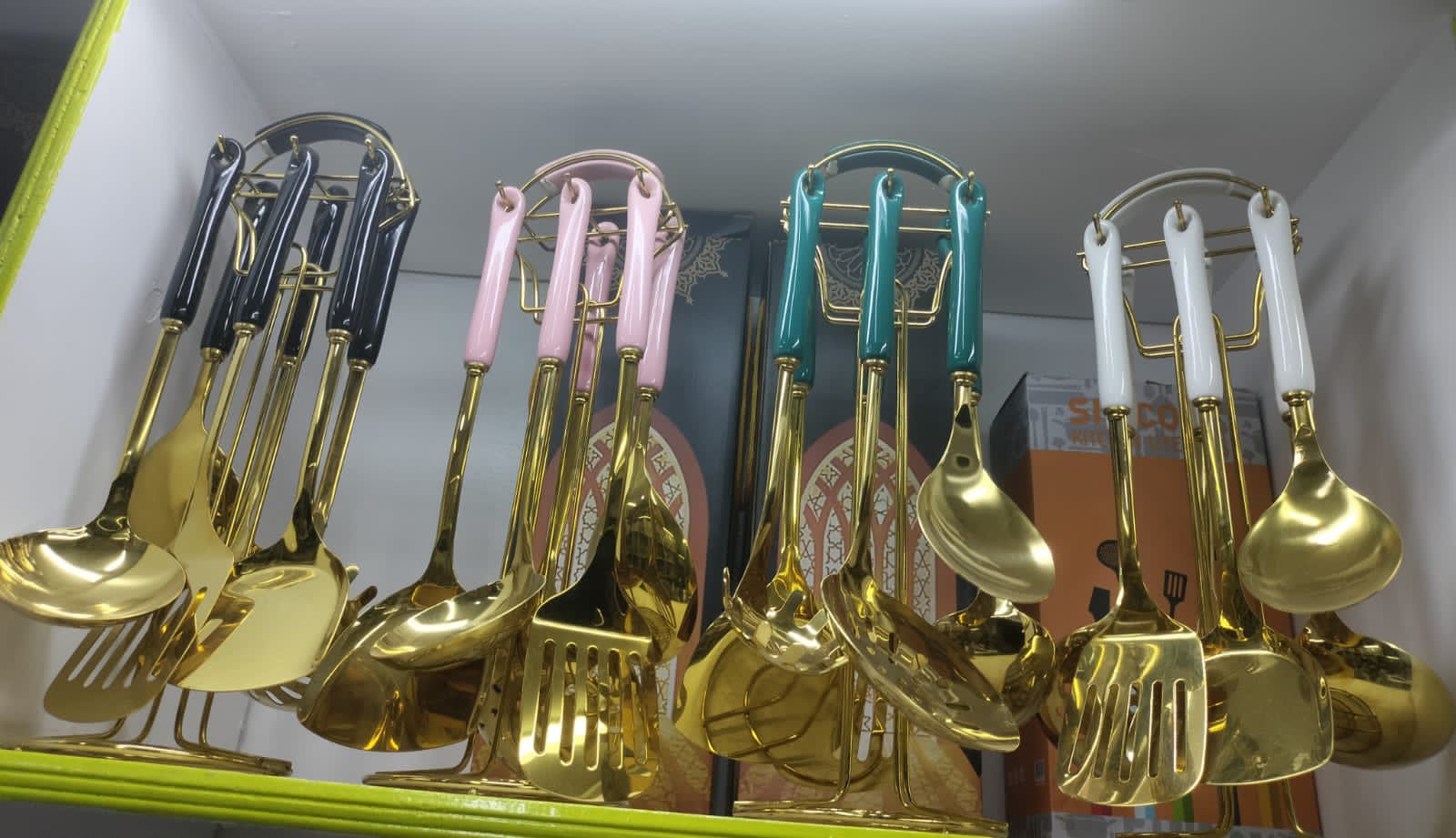 Gold serving spoons with stand