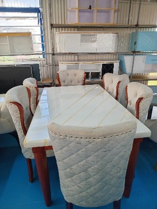 This elegant 6-seater dining set features a sleek marble-top table paired with six plush, high-back chairs for a refined yet comfortable dining experience. The glossy marble finish adds a luxurious touch and is easy to clean, making it perfect for both everyday meals and special gatherings.
