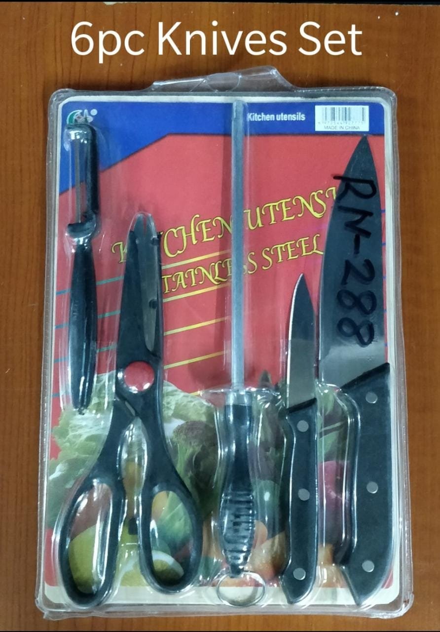 1pc Chopping board, 1pc Sharpening Rod, 1pc Kitchen Knife, 1pc Scissors, 1pc Peeler, 1pc Peel Knife.