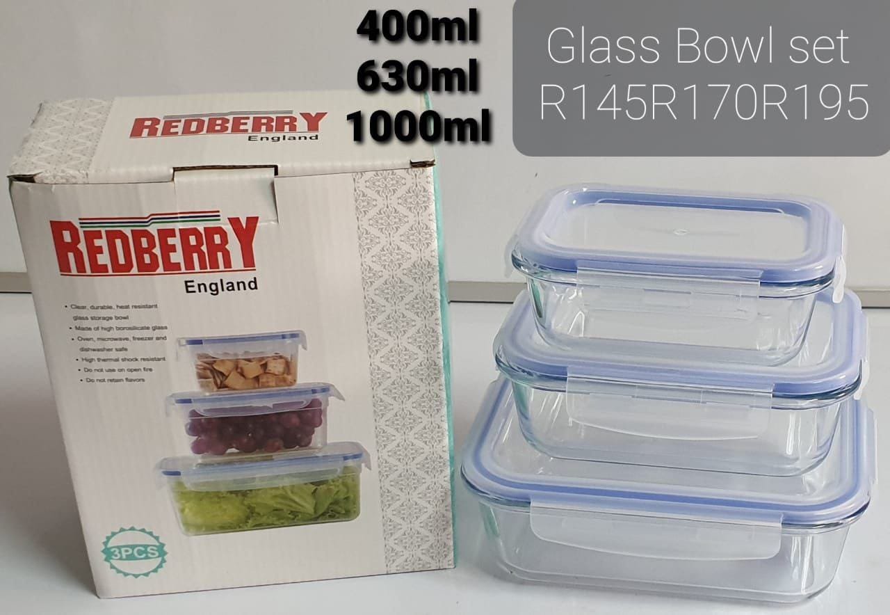 3pcs Square glass storage bowl set 400ml , 630ml, 1000ml
