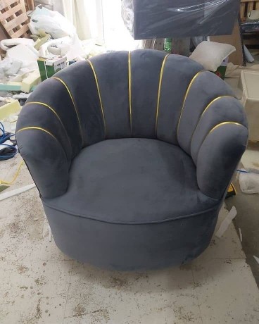 The chair is upholstered in velvet fabric, offering a soft, smooth texture and a luxurious feel. The model pictured comes in charcoal grey with gold-accented piping, but it is available in a variety of colors, allowing for easy customization to suit different interior styles—whether bold and vibrant or soft and neutral.